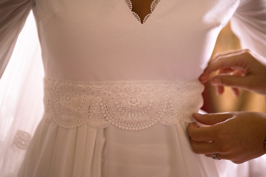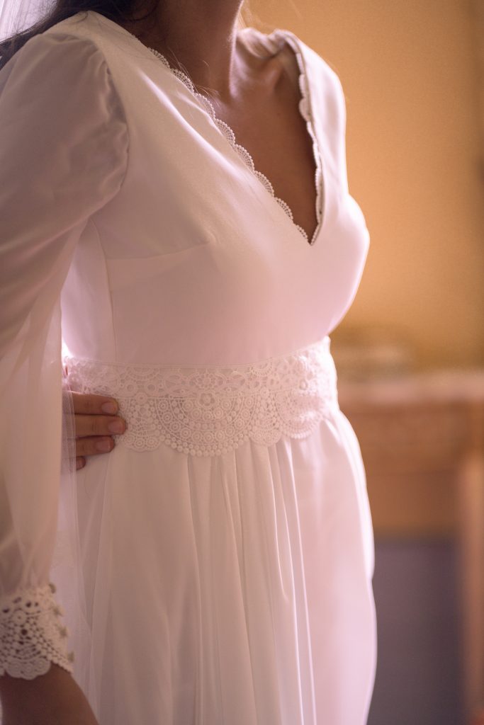 Elle avait une idée de ce qu'elle souhaitait et nous avons travaillé autour d'un robe féminine, élégante mais sans chichis. Un soupçon de dentelle et un jeux de matières pour mettre en valeur sa silhouette!