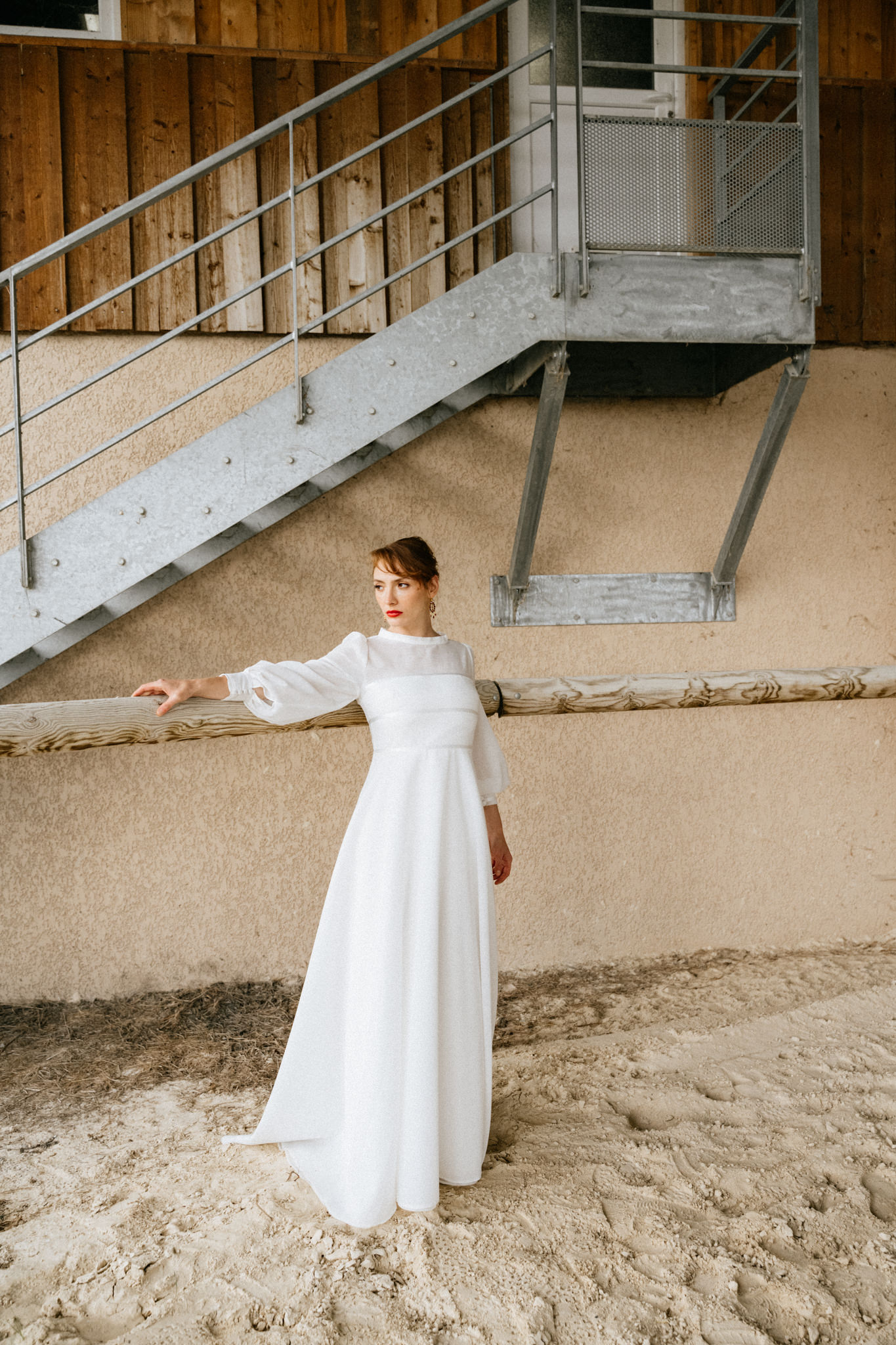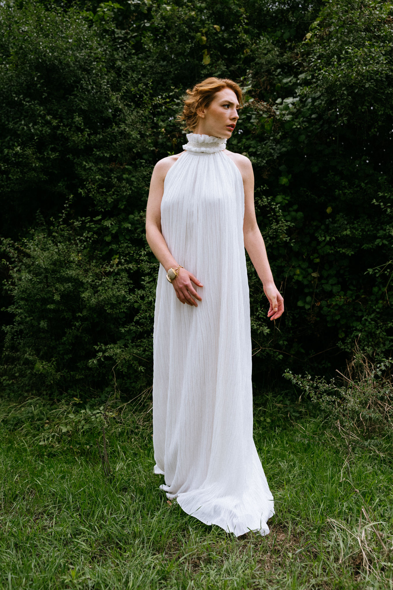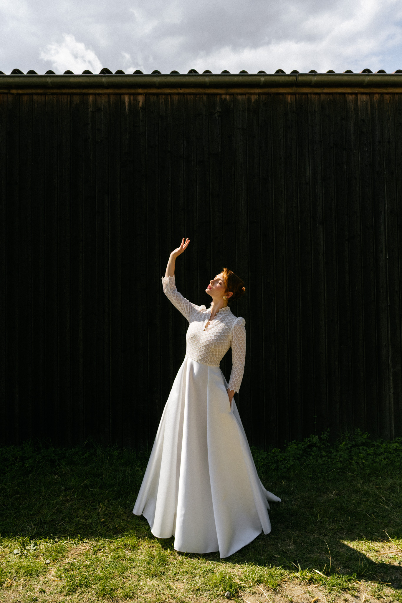 Les robes jouent sur les contrastes : coupes structurées qui sculptent la silhouette et matières aériennes qui apportent douceur et mouvement. Organza et mousseline créent des jeux de transparence légers, tandis que jacquard et la dentelle ajoutent relief et sophistication. Chaque modèle est pensé pour offrir confort et allure, avec un esprit très couture.