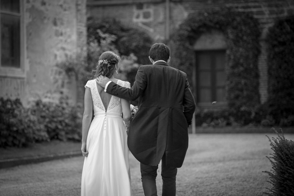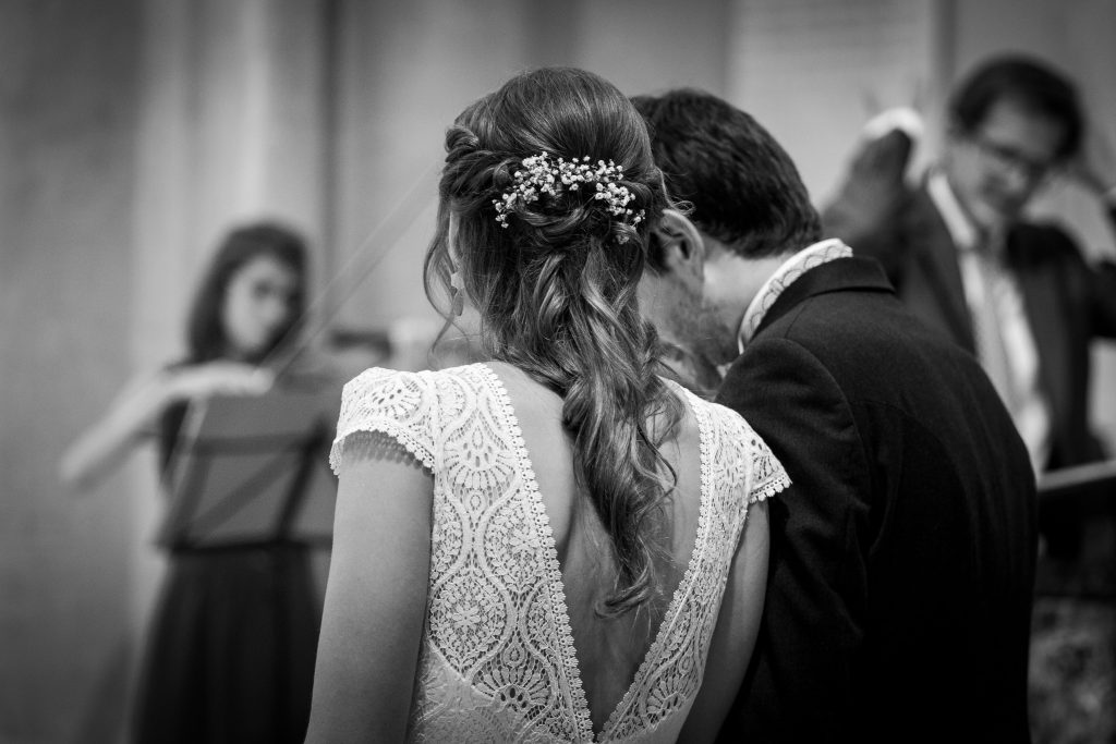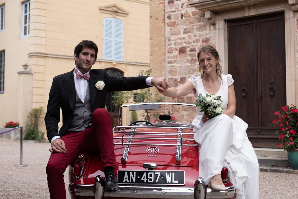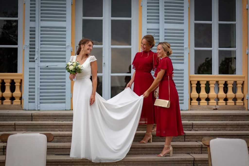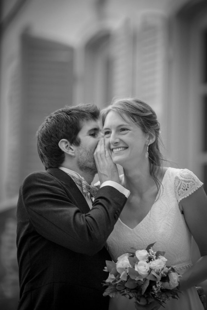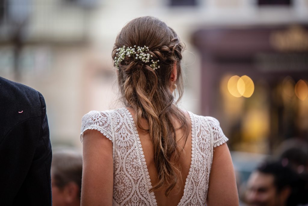 Elle se marie sur la plage, surprise pour la famille et les amis, sa robe est à l'image de sa personnalité : simple et naturelle avec les détails qui la sublime. Une jupe ample en piqué de coton surmontée d’un haut en guipure graphique avec ses petits mancherons courts (qui au départ était des manches longues !) lui donne une allure de jeune fille en fleurs.