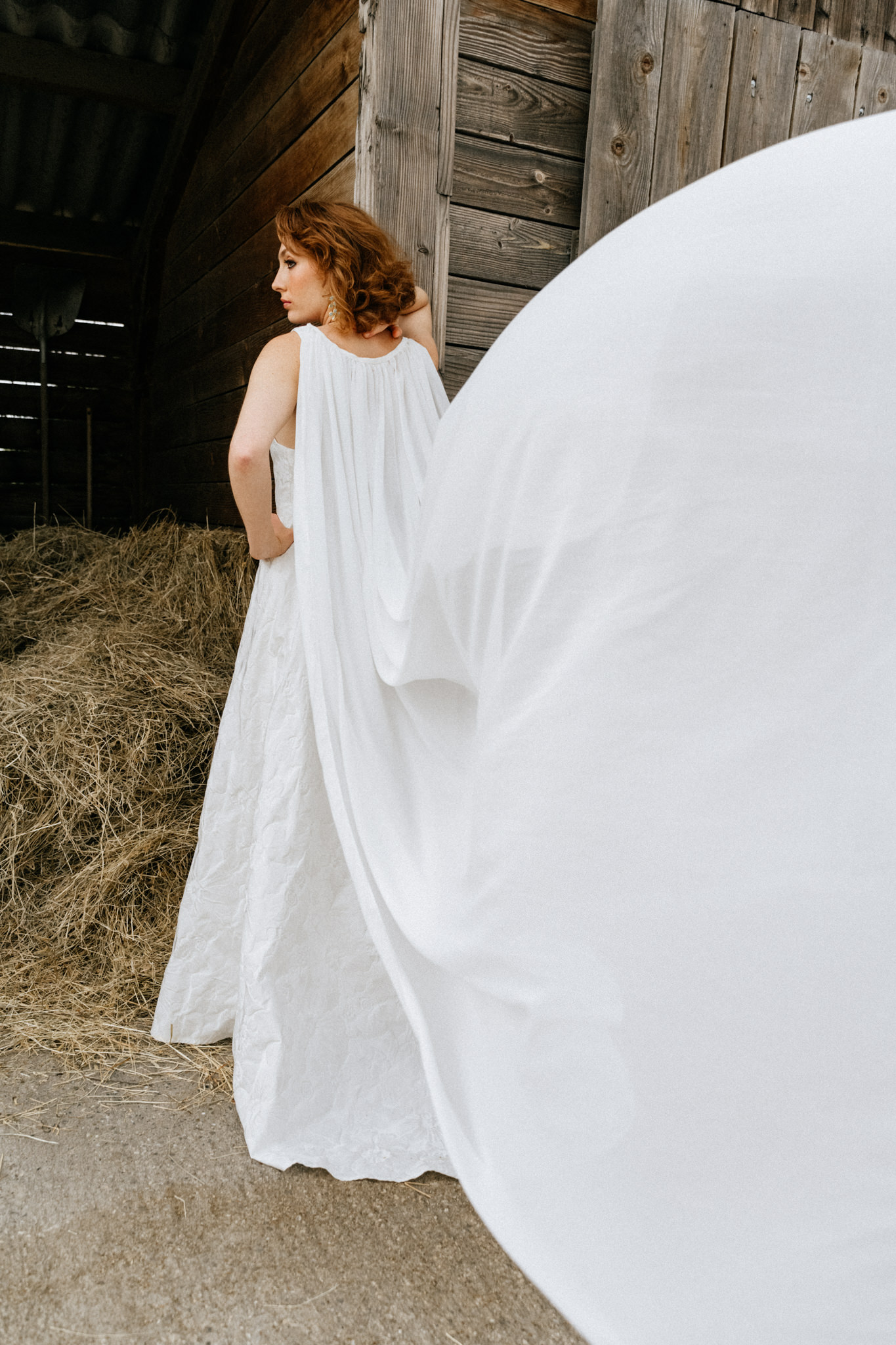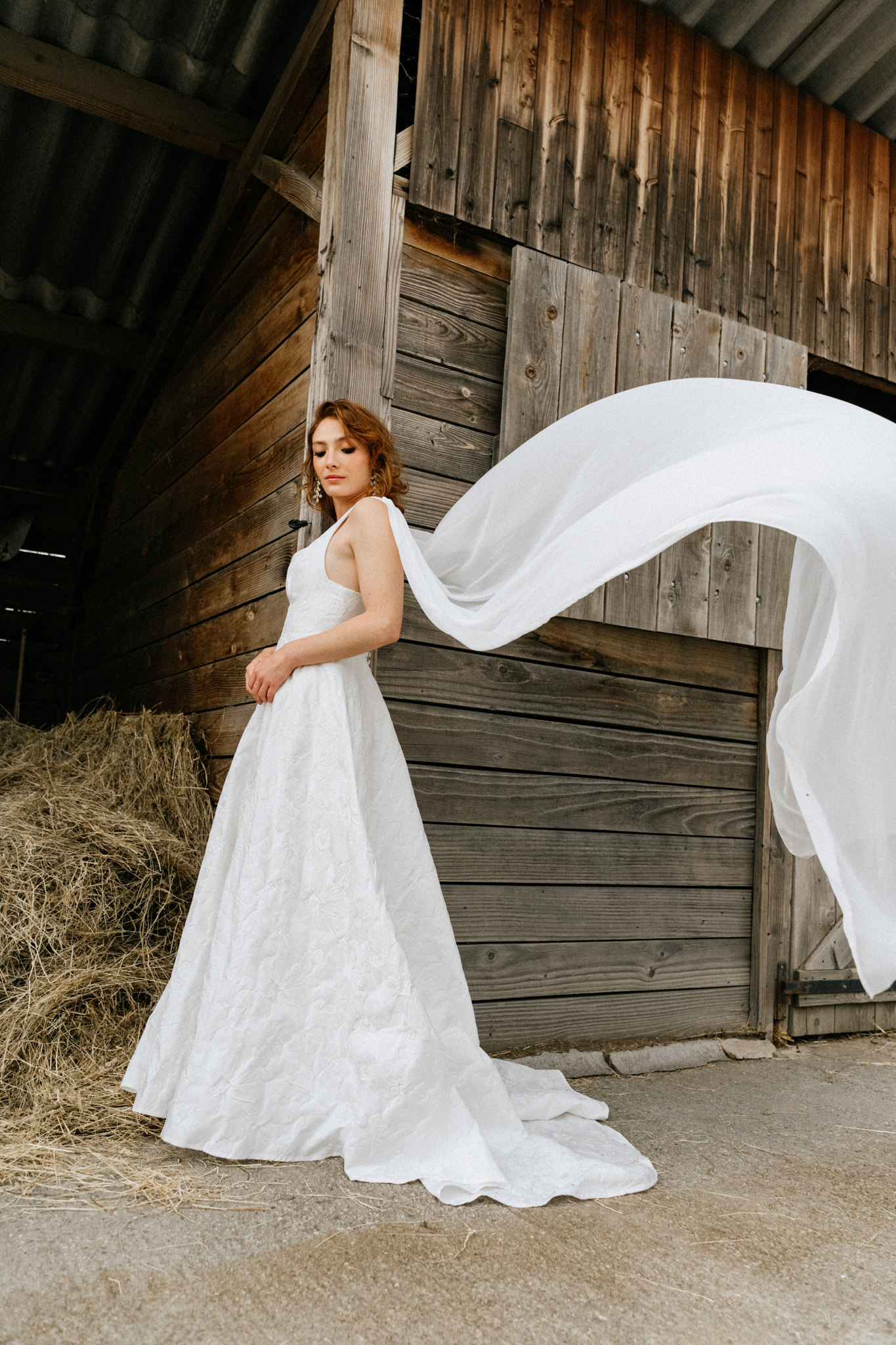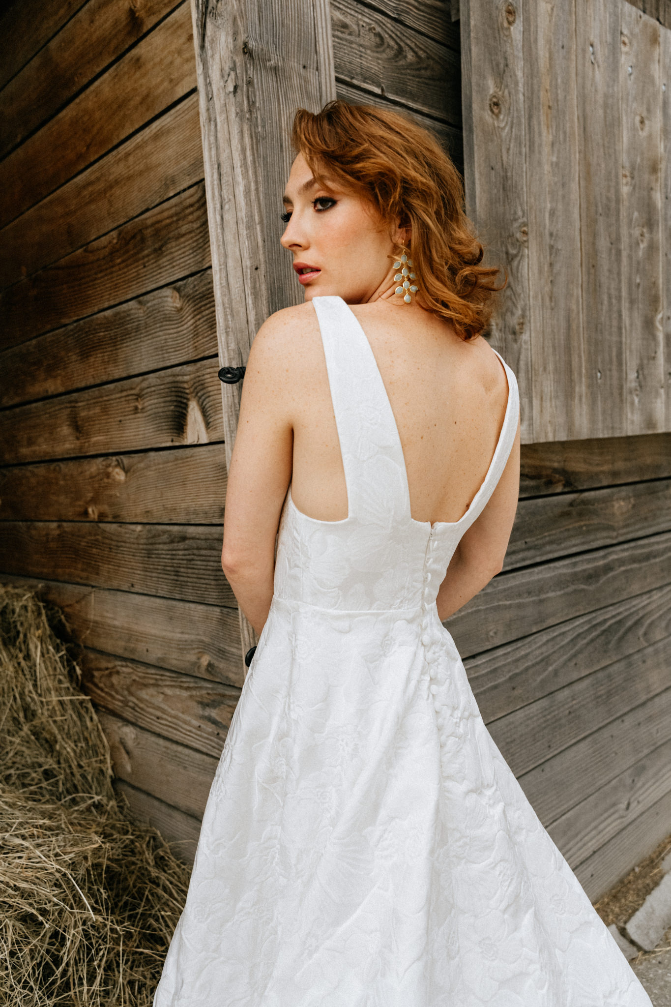 Un jacquard de satin floral, un décolleté dévoilant juste ce qu'il faut, une large jupe et une cape légère !