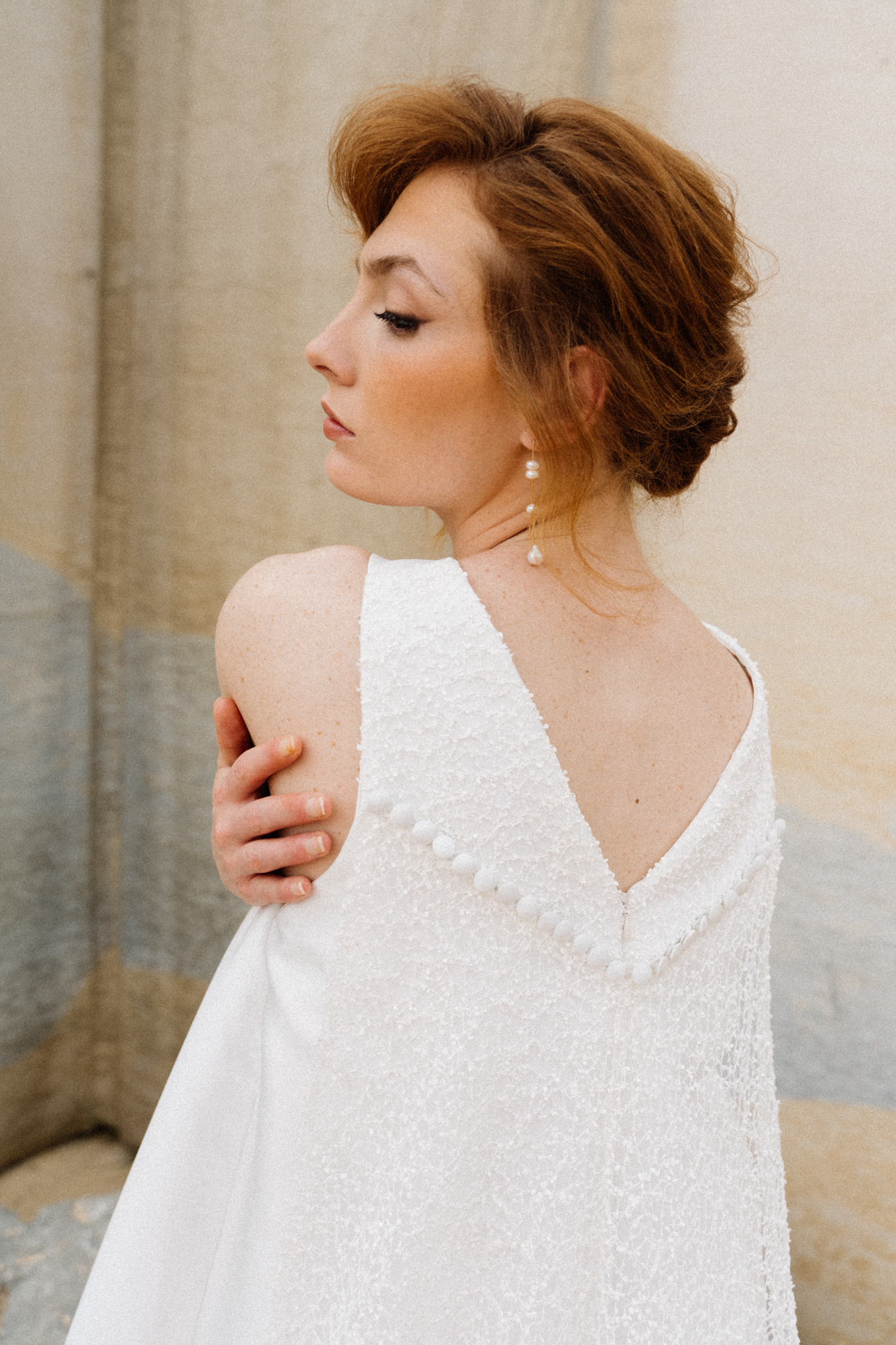 Une cape amovible en dentelle de Calais complète cette robe à l'allure de reine.