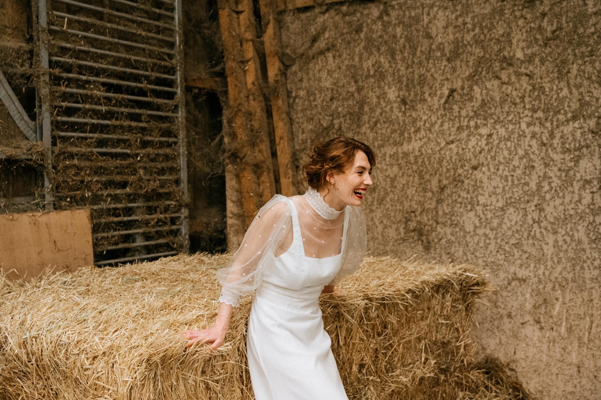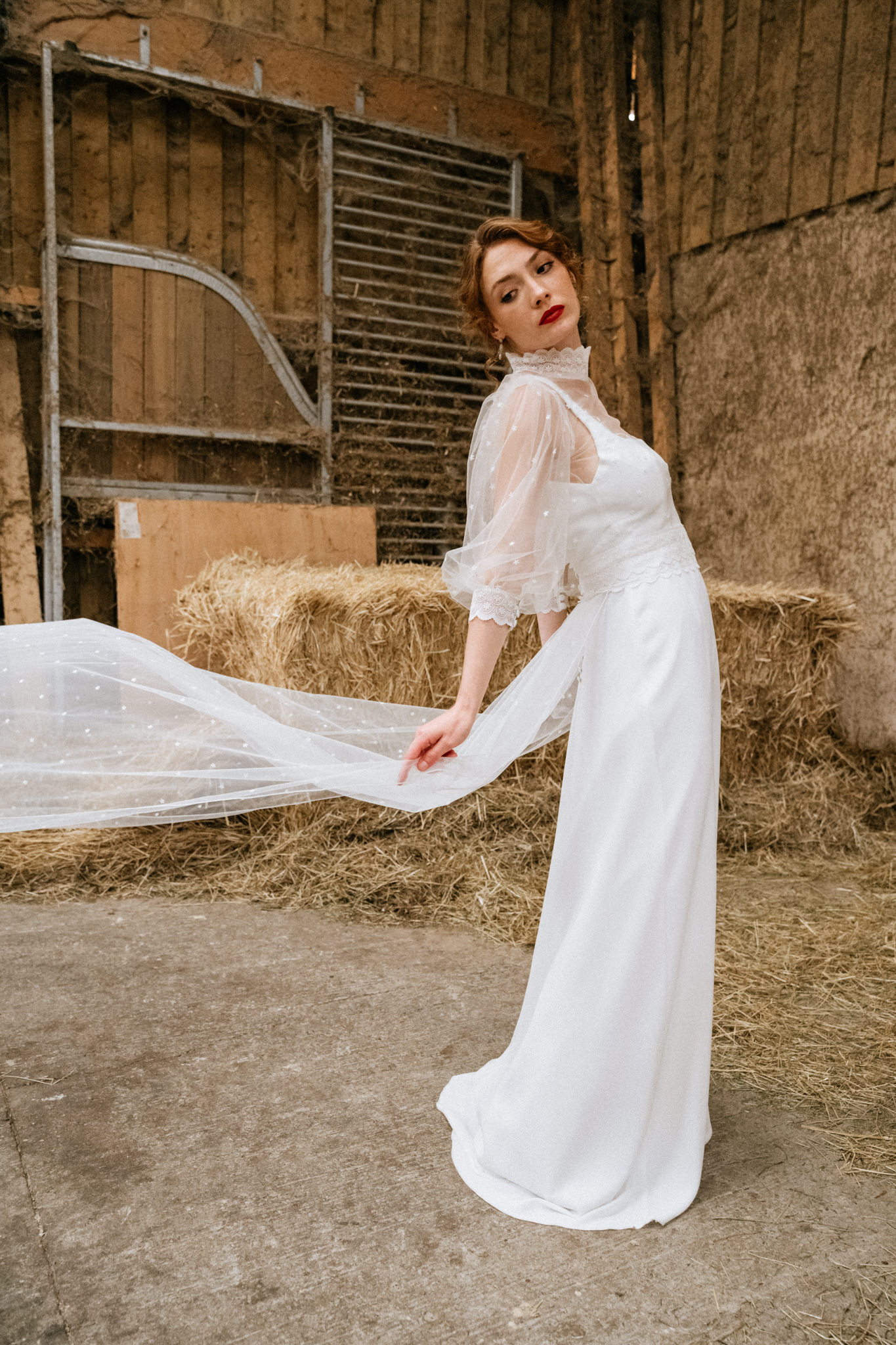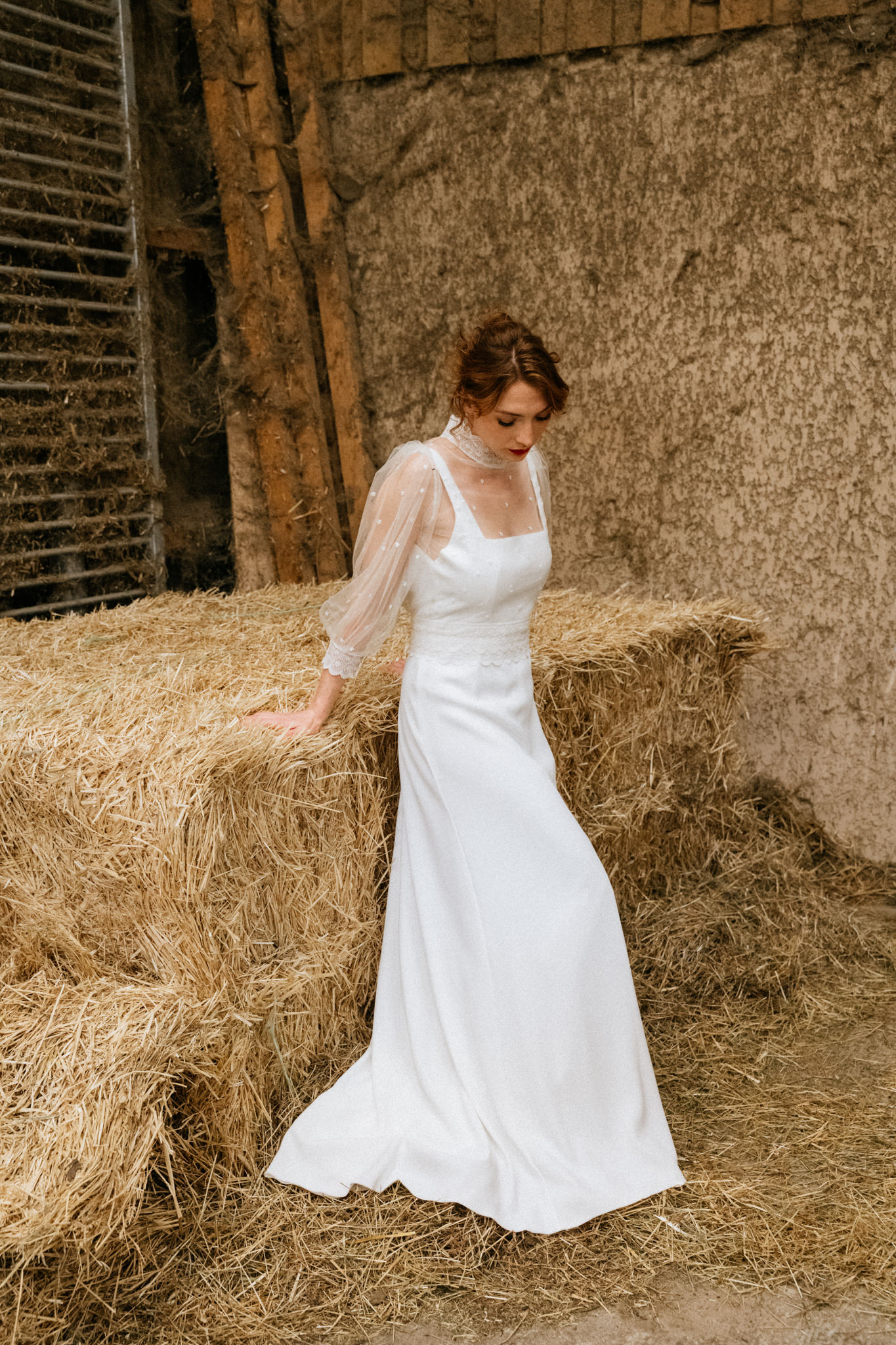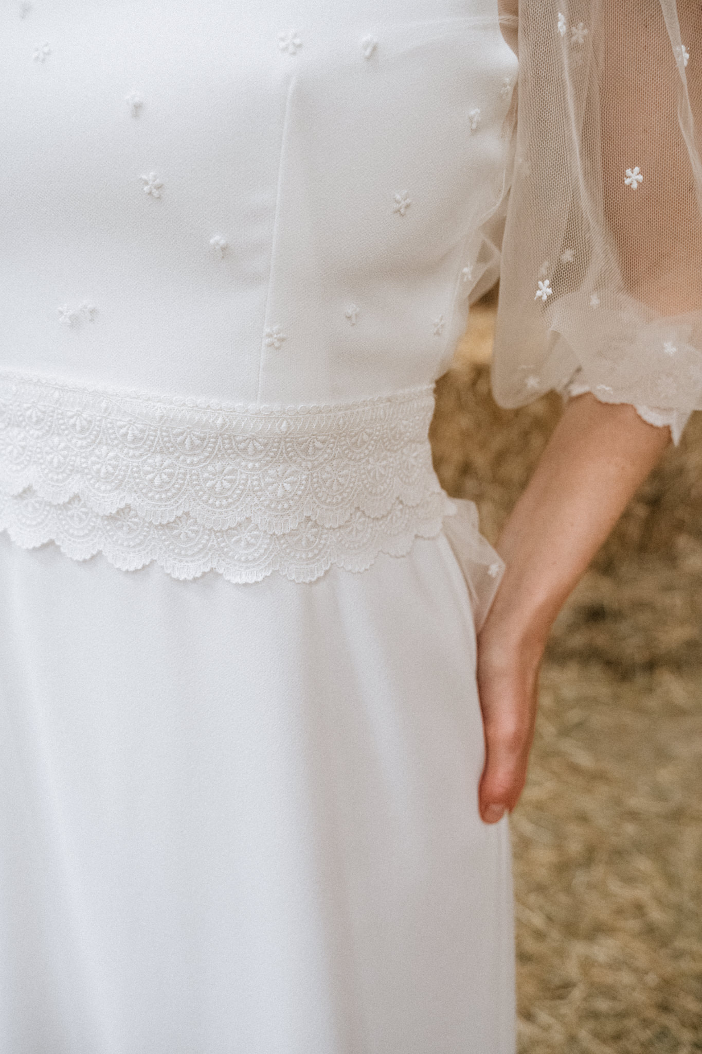 Une robe près du corps soulignée par un top en tulle brodé et dentelle et une traine amovible.